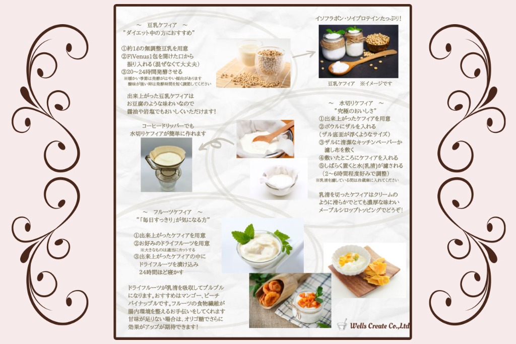 FiVenusについて about 開発コンセプト 私は今までさまざまな健康体験をしてきました。その中でも最も長い間食べ続けていて、一番自分の中で良かった製品がケフィアでした。私自身ケフィアを食べ続けて25年、ケフィアのチカラや良さを皆様にお伝えしたいと思い、今までの経験をフルに生かしてケフィア種菌「FiVenus(フィビナス)」を作り上げました。味、菌の配合量、扱いやすさなど、どれをとっても自慢の商品となっております。牛乳はもちろん豆乳でも非常においしく作れますので、ミルクが苦手な方や動物性脂肪が気になる方、ダイエット中の方にもお試しいただける製品となっております。昨今では、予期せぬさまざまなリスクが我々に襲いかかってきています。毎日の習慣で免疫力を高め、守るチカラを身につけましょう。継続は力なり!「FiVenus(フィビナス)」を食べて健康生活を楽しんでください。“Wells Create(ウェルズ クリエイト)”は皆様の健康を応援致します。 Read More ラインナップ line up Read More FiVenusの作り方 how to make FiVenusの作り方 注意点 FiVenusアレンジテクニック Read More ブログ blog 2023/11/29 【お知らせ】Fivenusフィビナス定期お届けはじめました! 2023/11/28 年末キャンペーンはじまります! 2023/07/06 日本におけるケフィア普及のレジェンドが再び! Read More お客様の声&FAQ voice & faq Read More